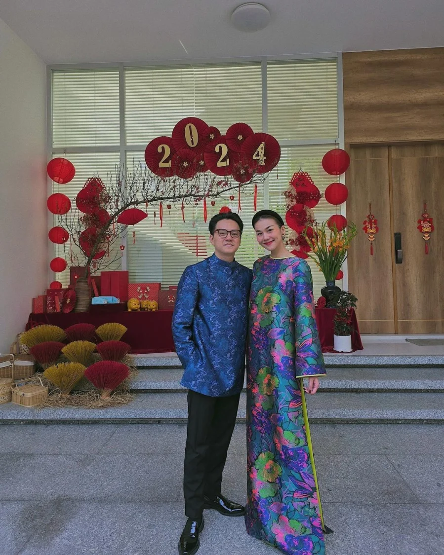 Gia đình Quỳnh Anh Shyn vẫn giữ truyền thống mặc áo dài hằng năm và chọn màu xanh lam cho mùa Tết 2024.