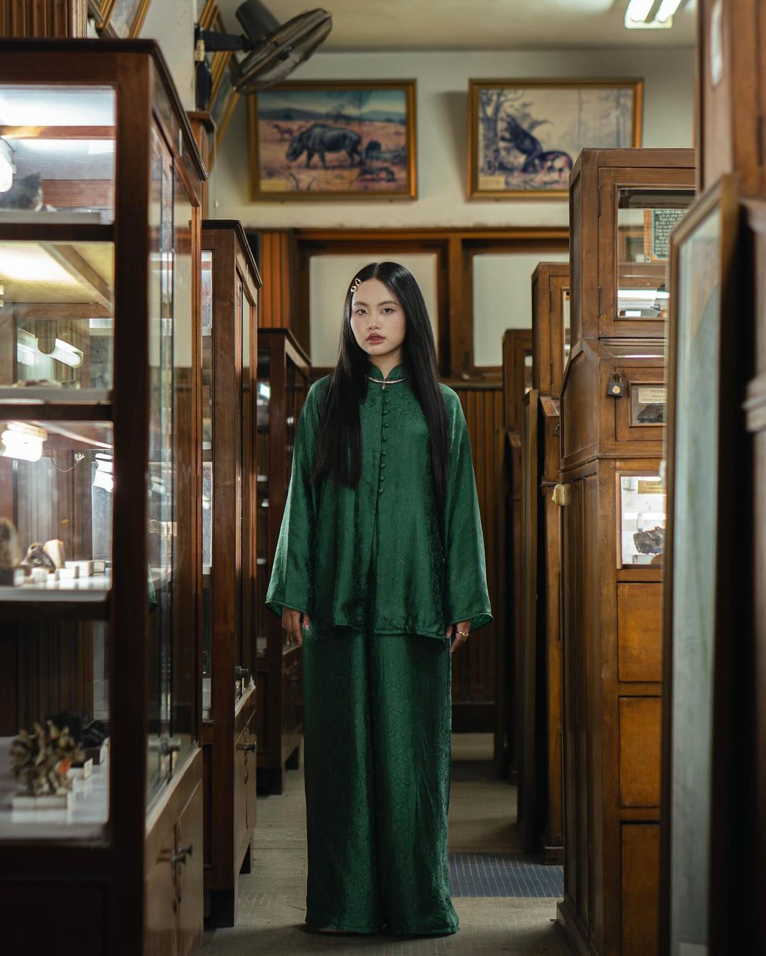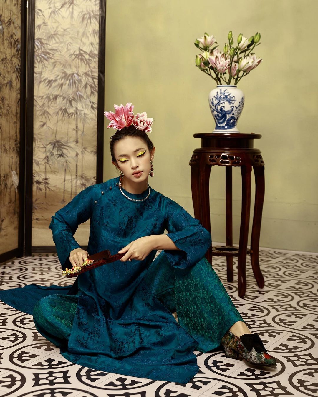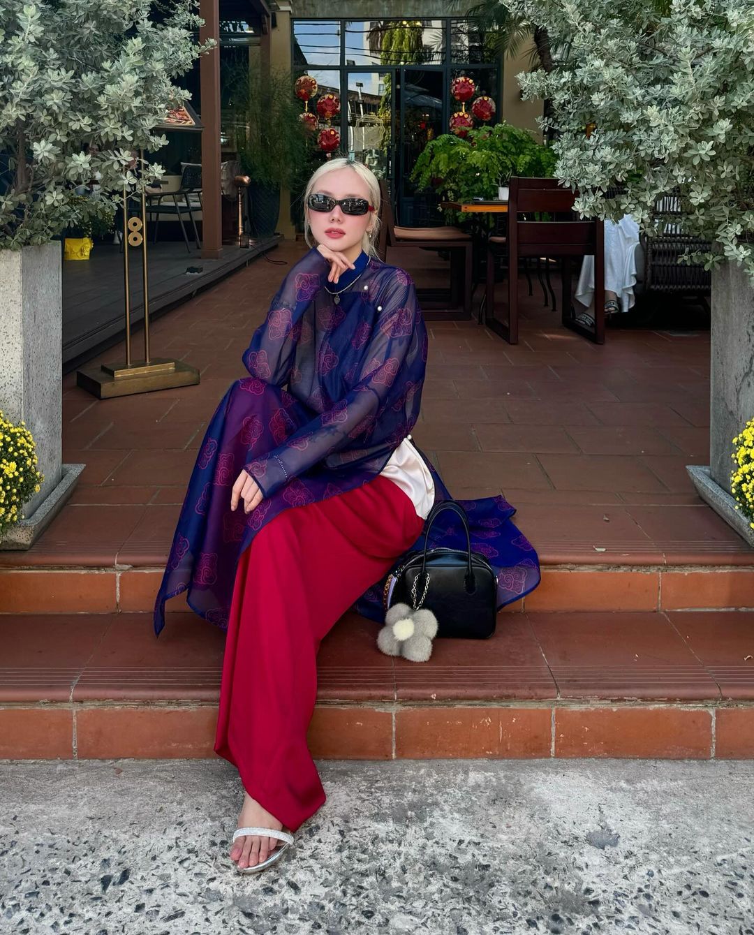 Phương Ly vẫn giữ phong cách cực “ngầu” trong tà áo dài xanh đỏ cá tính. (Ảnh: @may__lily)